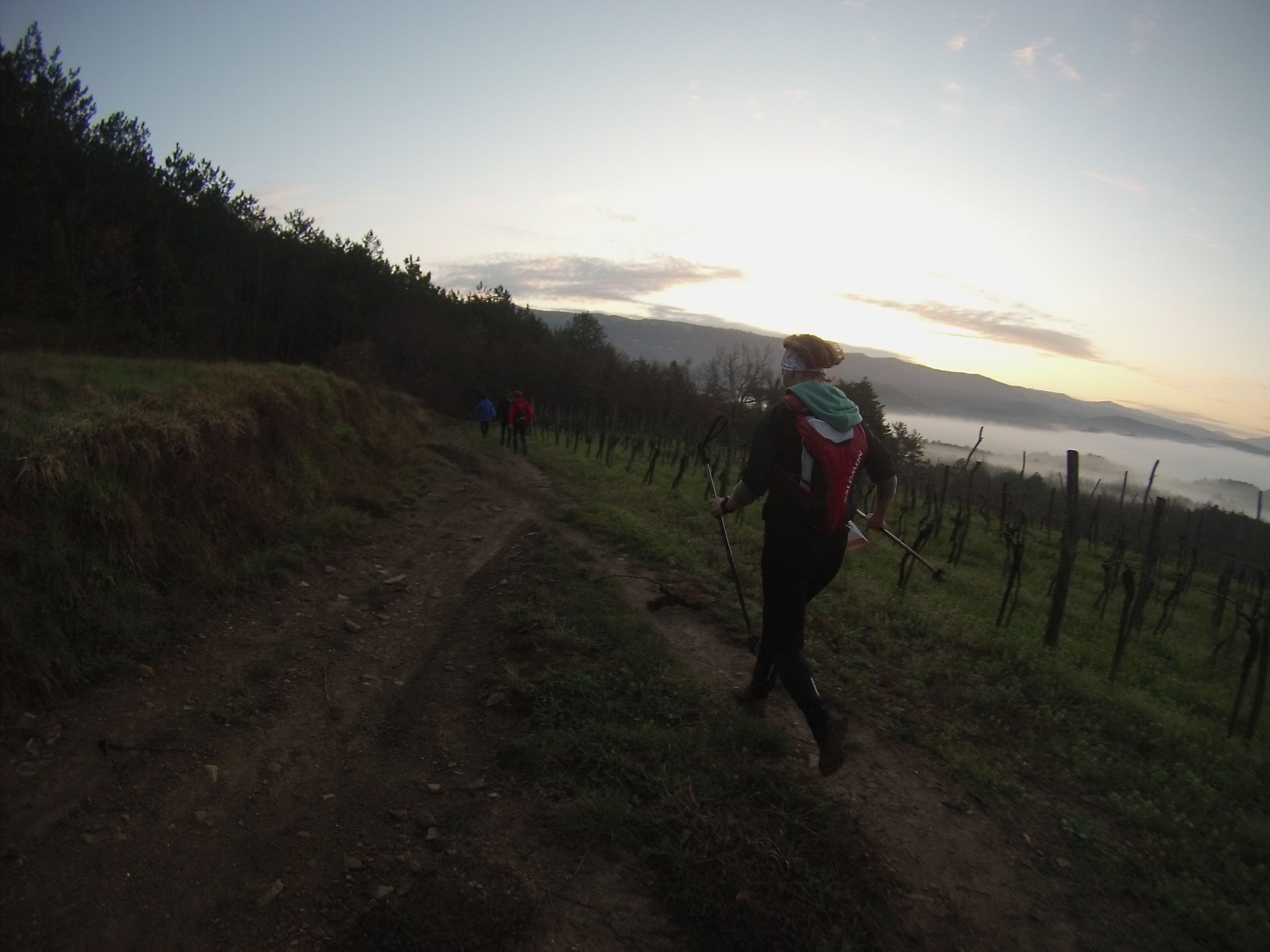 Pomaly prichádza svitanie a my už sa blížime ku kontrole, na ktorej štartujú stovkáry (kilometrový). Predtým ešte stihneme klesnúť a následne vystúpať úžasným kamenistým chodníkom s príkrymi zrázmi. Nový deň a nový štart a nás čaká zvyšných 100 km a začínajú pekne z ostra výživným stúpaním a aby to nebolo málo za prvým výšvihom nasledujú ďalšie dva. A takto to má pokračovať aj ďalej, strmé výstupy prekladané podobne strmými zbehmi, sem tam sa objaví zasnežený fľak, aby sme si pripomenuli ako sa behá po snehu. Prichádzame na 100 kilometer Petr, ktorý s nami beží už od Buzetu pribieha zakrátko po nás stále rozhodnutý pokračovať riešime, kde by sme sa najedli, našťastie blízka reštaurácia je stále otvorené a tak si dávame podaktorý hubovú dvoj kombináciu v podobe hríbovej polievky a cestovín s hríbmi, no a samozrejme pivko nesmie chýbať. Dojeme a rýchlo prebalíme, čo potrebujeme a vyrážame ďalej.. a ešte netušíme že ani nie do dvoch hodín tu budeme ticho sedieť a čakať na odvoz.