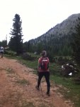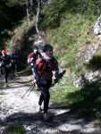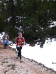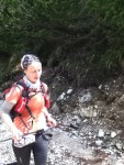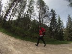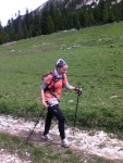 Štart bol pomalý, had z bežcov sa ťahal do kopcov, v ktorých sme neosameli ani na malú chvíľu. Každé menšie zastavenie, alebo odskočenie znamenalo predbehnutie 5 bežcami. Udržiavali sme si dobré tempo smerom hore a v zbehoch, ktoré boli prudko bežateľné sme sa nešetrili. Sem tam som vytiahla GoPro, aby som zachytila krásu hôr, ku ktorým sa môžem vrátiť s vyloženými nohami. Zo začiatku sa mi točila hlava, neviem, či som až taký romantik, alebo je to horším krvným obrazom a výškou okolo 2.000 mn.m. Terén bol každopádne veľmi jednoduchý, výstup hore, zostup dole a potom jedna rovinka, ktorá nás úplne zabila. Nedalo sa bežať žiadnemu účastníkovi v našom časovom poli, všetci sme poslušne išli, ťukajúc palicami do bielych kamienkov, ktorými bola vysypaná cesta cca 5-7km. Zabiják na unavené nohy. Zbyněk mal jediné prianie, pivo na ďalšej občerstvovačke. Keby mne sa tak plnia priania na počkanie asi som už zajačik duracell. 🙂 Dopriali sme si hneď dve tretinkové pivká a pár kúskov parmezánu, labužnícky sme si dopriavali len to najlepšie, a rýchlo do kopcov, čakalo nás, našťastie, hodinové stúpanie.