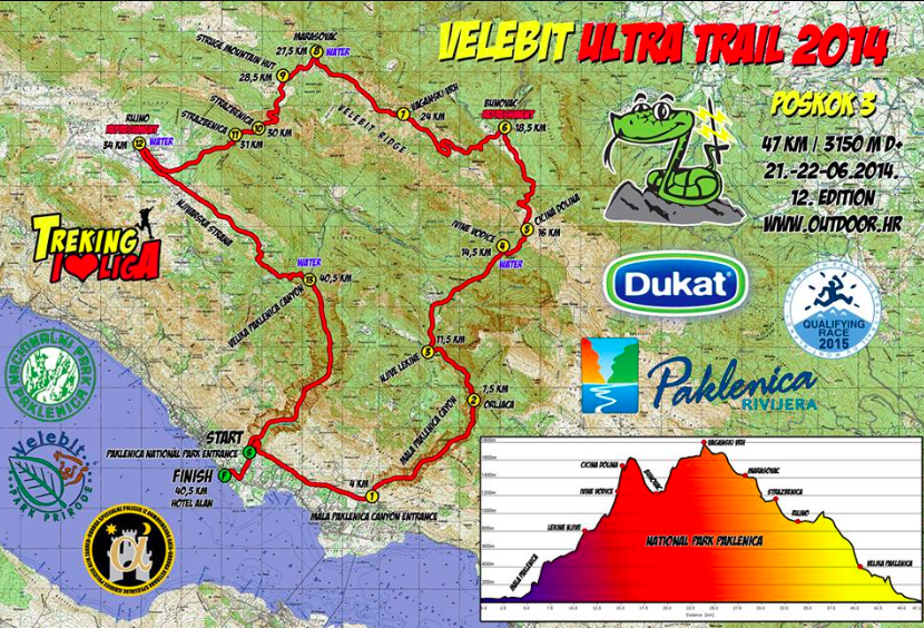 Dopĺňam vodu u chaty správcov NP a začínam stúpať na Veliko Rujno. Sem prichádzam až o jedenástej večer. Našťastie už som mal čelovku so sebou. Môj plán na čas okolo 20 hodín je v prachu a teraz už je len otázka ako veľká bude odchýlka. Prezúvam z rozpadnuvších sa Mizun do rozbitých Asicsov a dávam sa do pohybu. Škoda, že nepoznajú reflexky, možno by som nemusel blúdiť dobrú hodinu, než nájdem cestu do ďalšieho luxusného klesania. Podklad ideálny: štrky rôznych frakcií, do toho kamene ako ľudská hlava a plus všakovaké pokrivené vápencové platne, ktoré dokonale pohlcujú svetlo z čelovky a tak človek do posledného okamihu netuší ako sú naklonené. A to všetko dokonale prekryté vegetáciou. Keď už si myslím, že to nikdy neskončí prichádzam druhý krát do Veľkej Paklenice, aby som prácne zbehnutých 800 výškových znova nabral na Cierny vrch. Posledná chuťovka na tejto trase ktorá vyzerá ako EKG kardiaka.